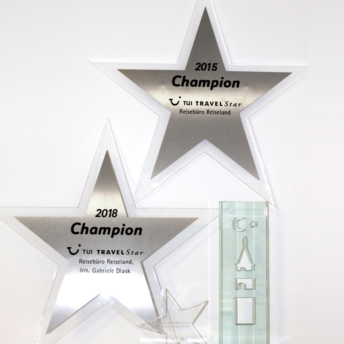 Wir haben schon viele Auszeichnungen erhalten aber besonders stolz sind wir auf den TUI TRAVEL Star Champion den wir schon 2 × gewonnen haben und den von der TUI verliehenen TUI Award.